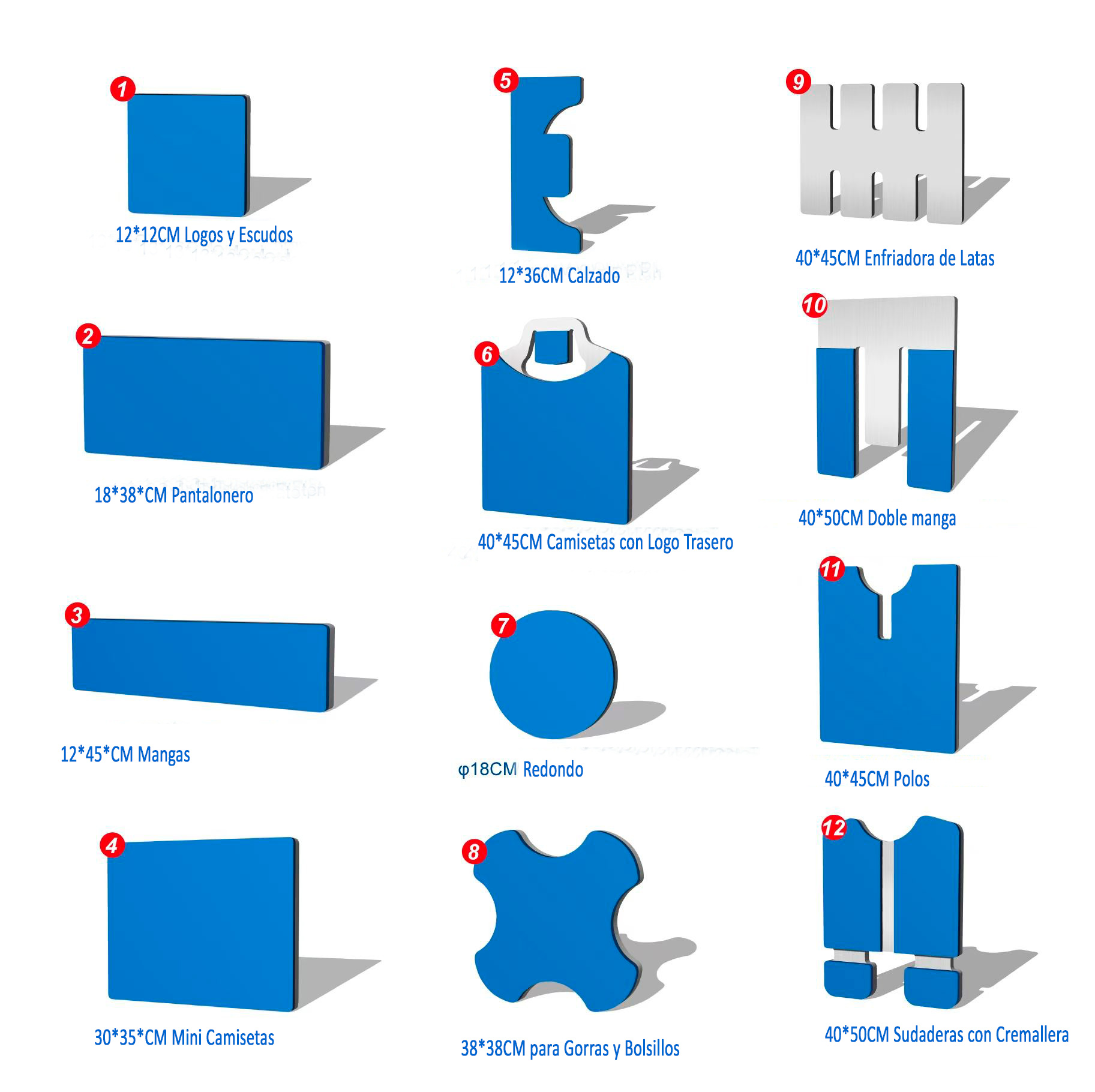 Dispones de soluciones específicas para cada aplicación: plato para etiquetas, pantalones, mangas, mini camisetas, zapatos, camisetas con logo frontal y trasero, plato redondo, sombreros, enfriadoras de latas, mangas dobles y polos. Cada uno pensado para adaptarse perfectamente a distintos formatos y mejorar la eficiencia en tu producción.
